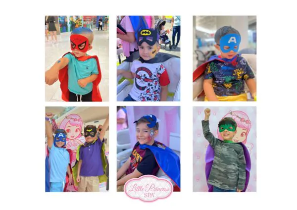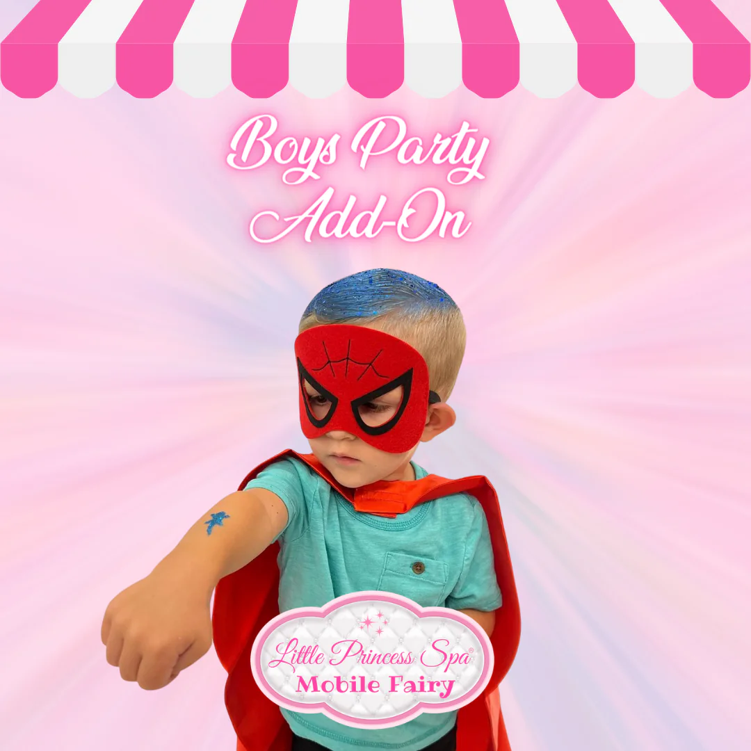 Boys Add-On INCLUDES: Hairdo, Cool Hair Color, Temporary Tattoo, Superhero Cape and Mask to take home.